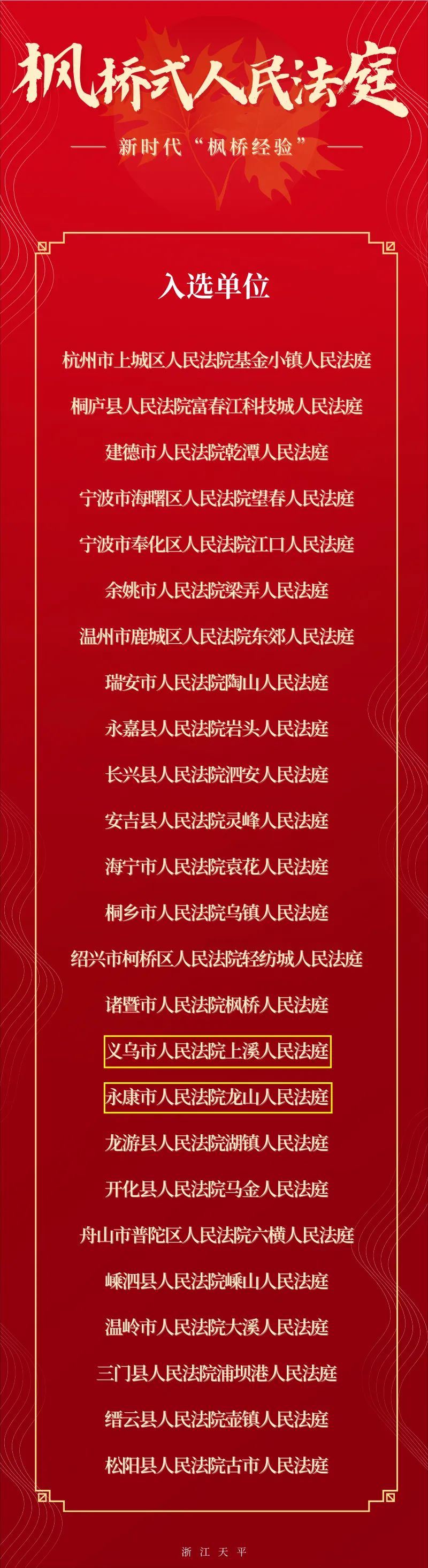 近日,中共浙江省委办公厅、浙江省人民政府办公厅下发《关于表扬全省“枫桥式人民法庭”的通报》,义乌市人民法院上溪人民法庭、永康市人民法院龙山人民法庭榜上有名!